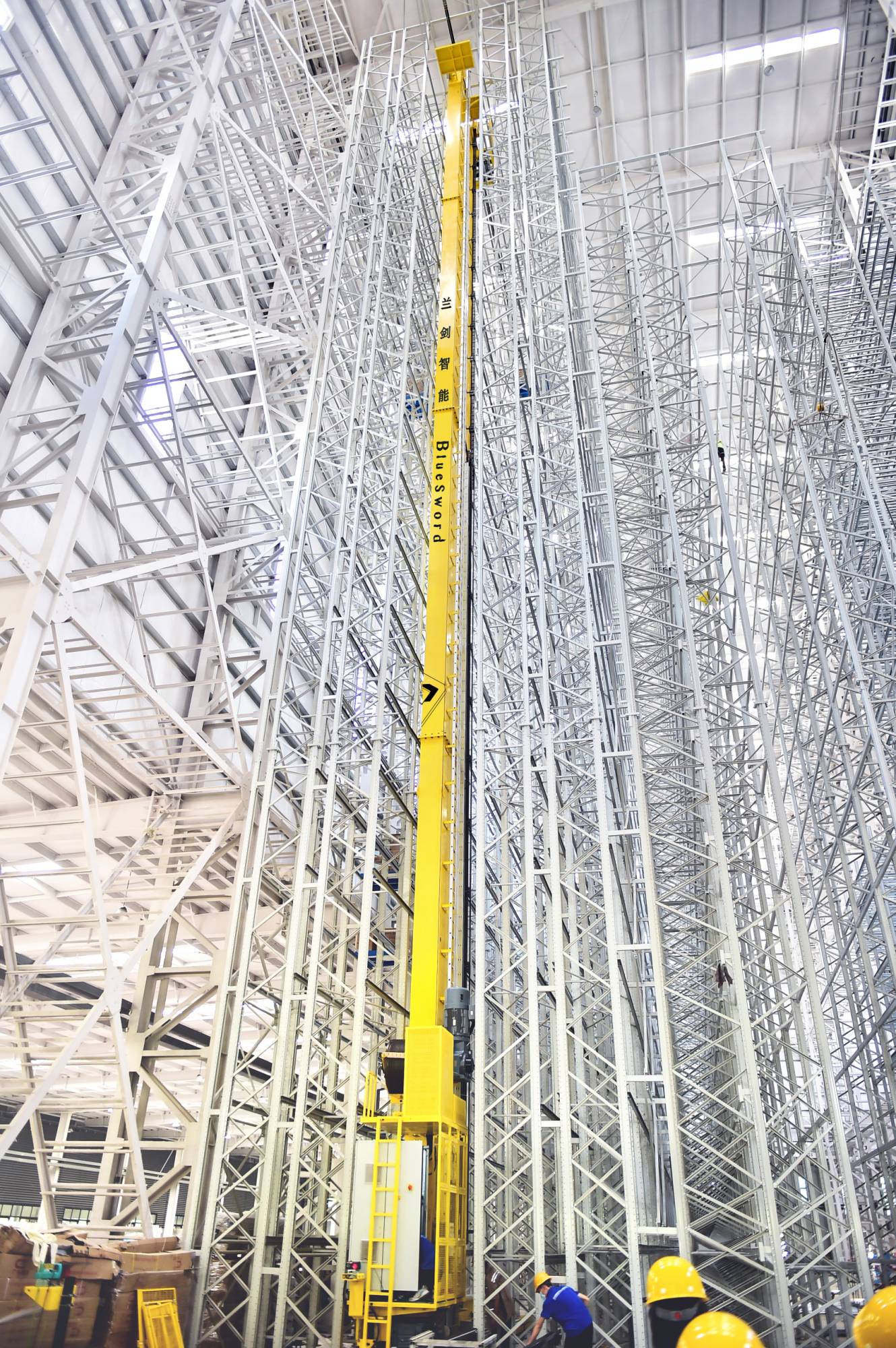 如果说抽象的数字难以形象地理解其高度之高,,,,,,,,举几个例子让你遥遥遐想一下。。。。。假定住房层高3米(一般不到3米),,,,,,,,堆垛机智能仓的高度就相当于有15层的小高楼房;;;;;比济南地标——泉标(高38.11米),,,,,,,,还要高上几米;;;;;在现场仰头看堆垛机上横梁,,,,,,,,需要用手扶着工程帽,,,,,,,,因为不止王冠会掉,,,,,,,,帽子也会掉,,,,,,,,令人不得不赞叹仰之弥高!